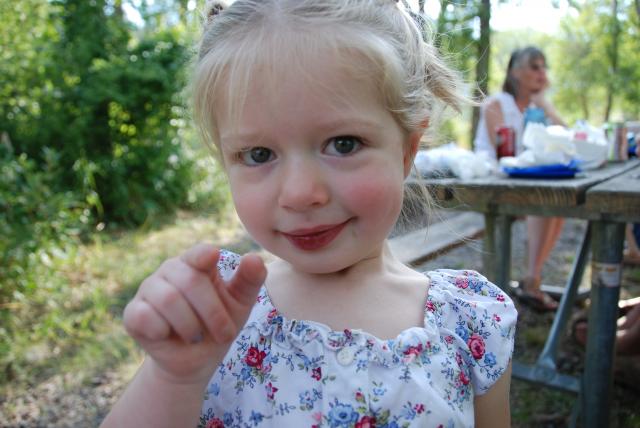 Things were fine, we were all done eating. Sophia had been really good not running around. But she got some little bee in her bonnet telling her to run, and in slow motion I saw her fall face down towards the pick-nick table. I couldn't get up fast enough. I knew this was gonna hurt and I was half expecting stitches and broken teeth. Too our dismay and surprise, she had no broken teeth, but she did bite half way through her bottom lip with her front teeth, as well as separating the gum that came down to the 2 front teeth.