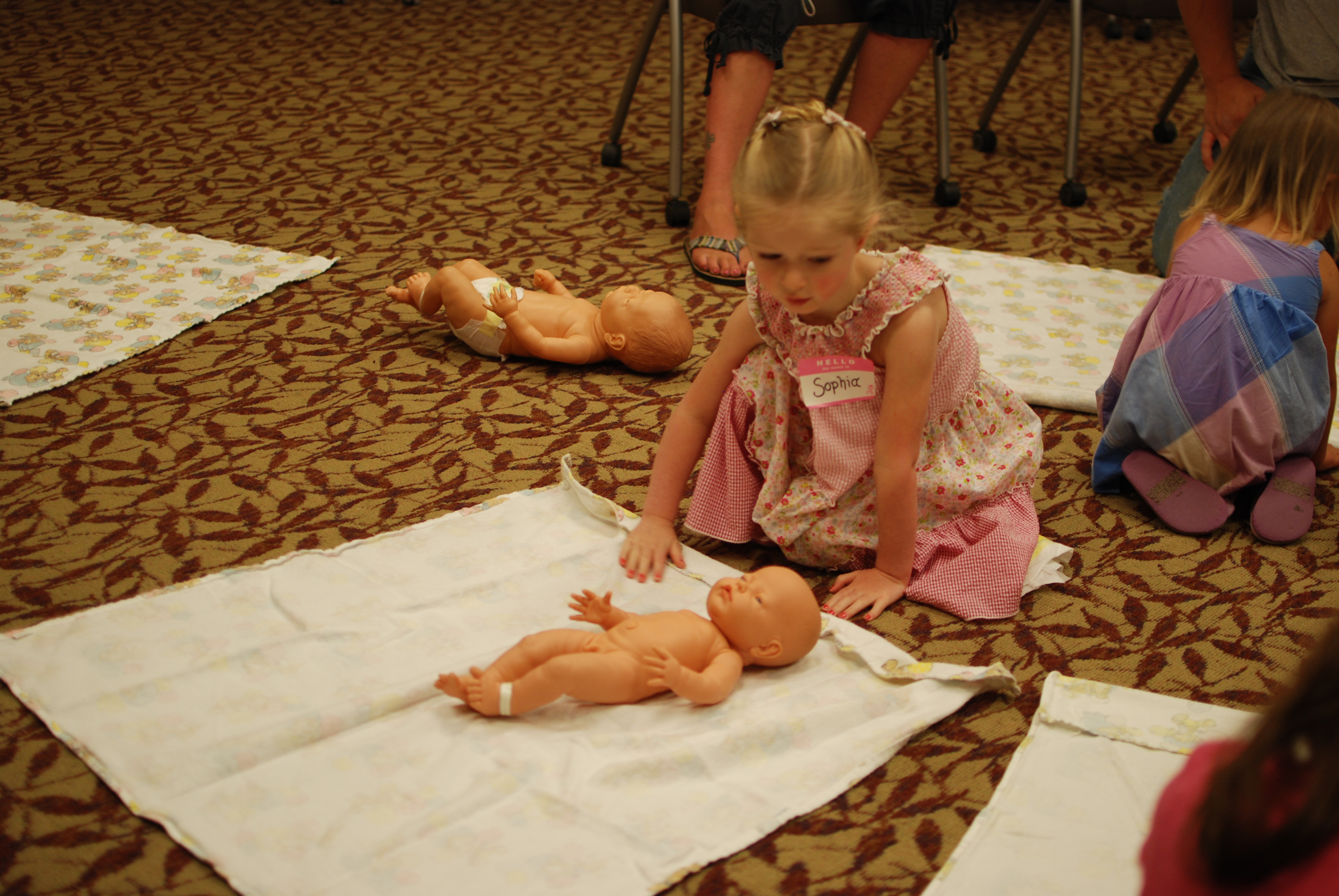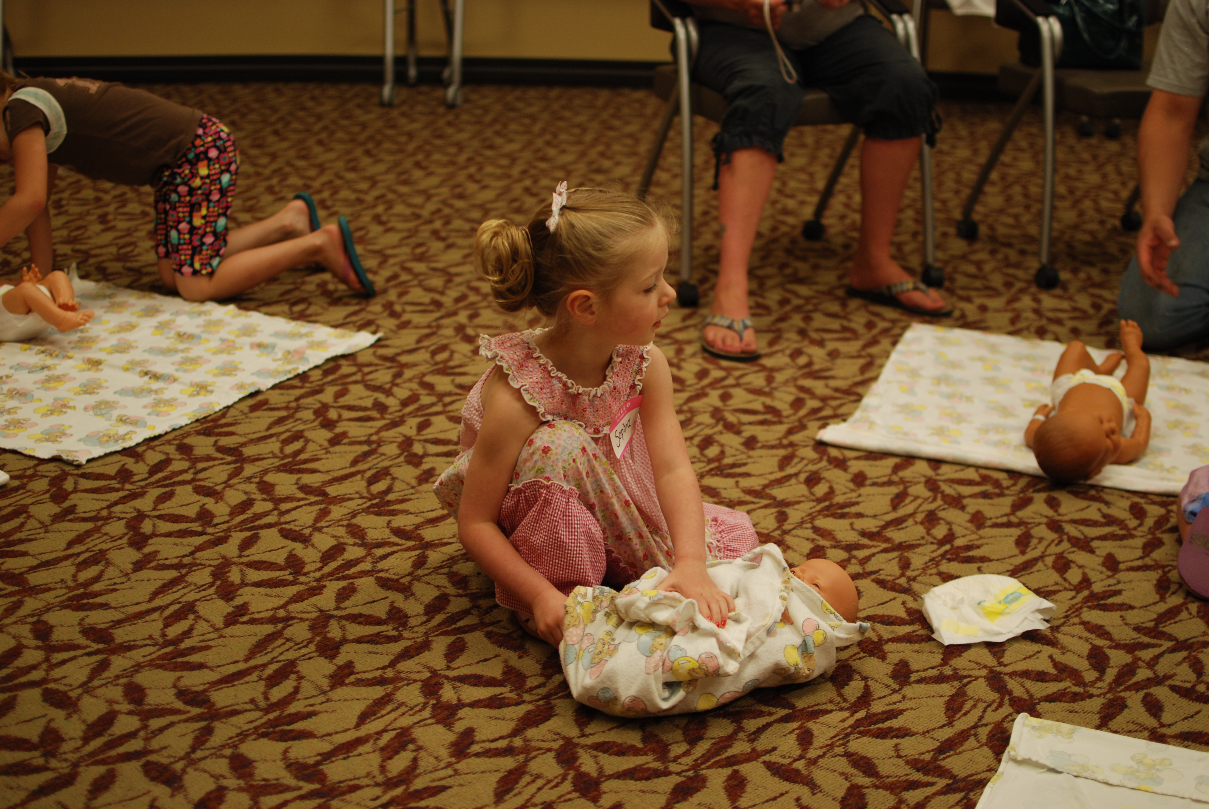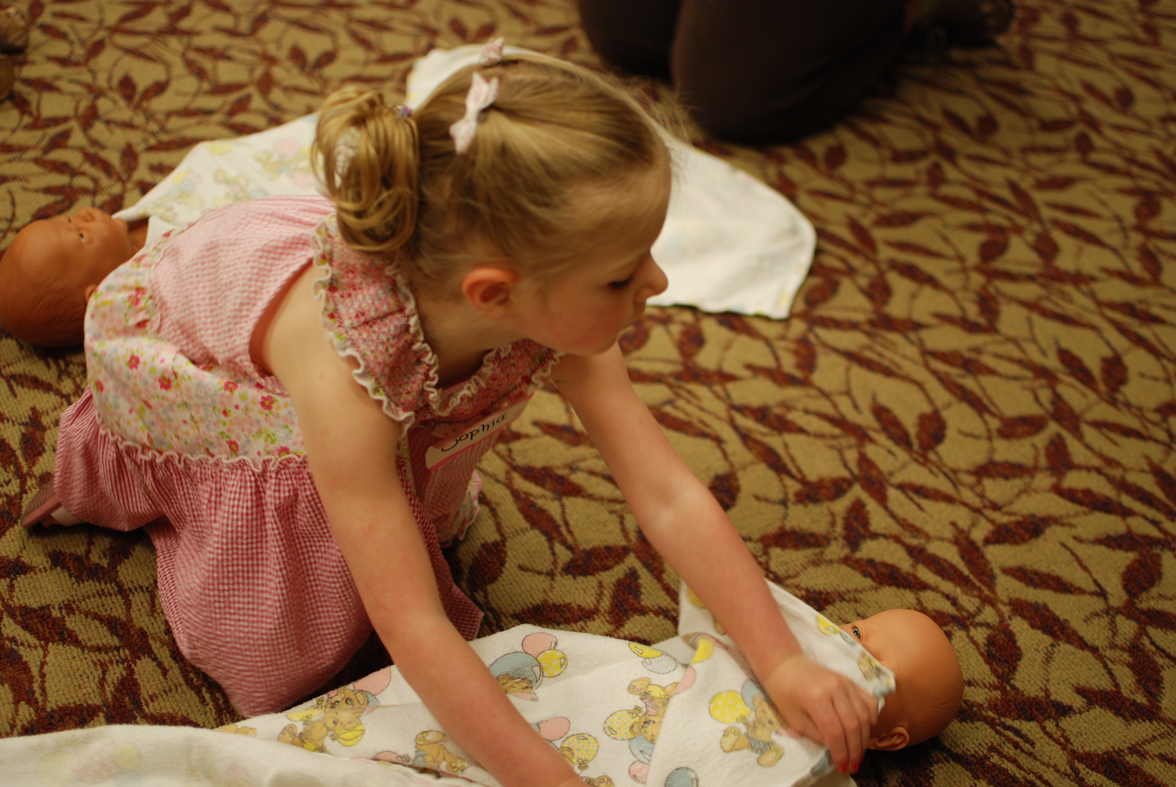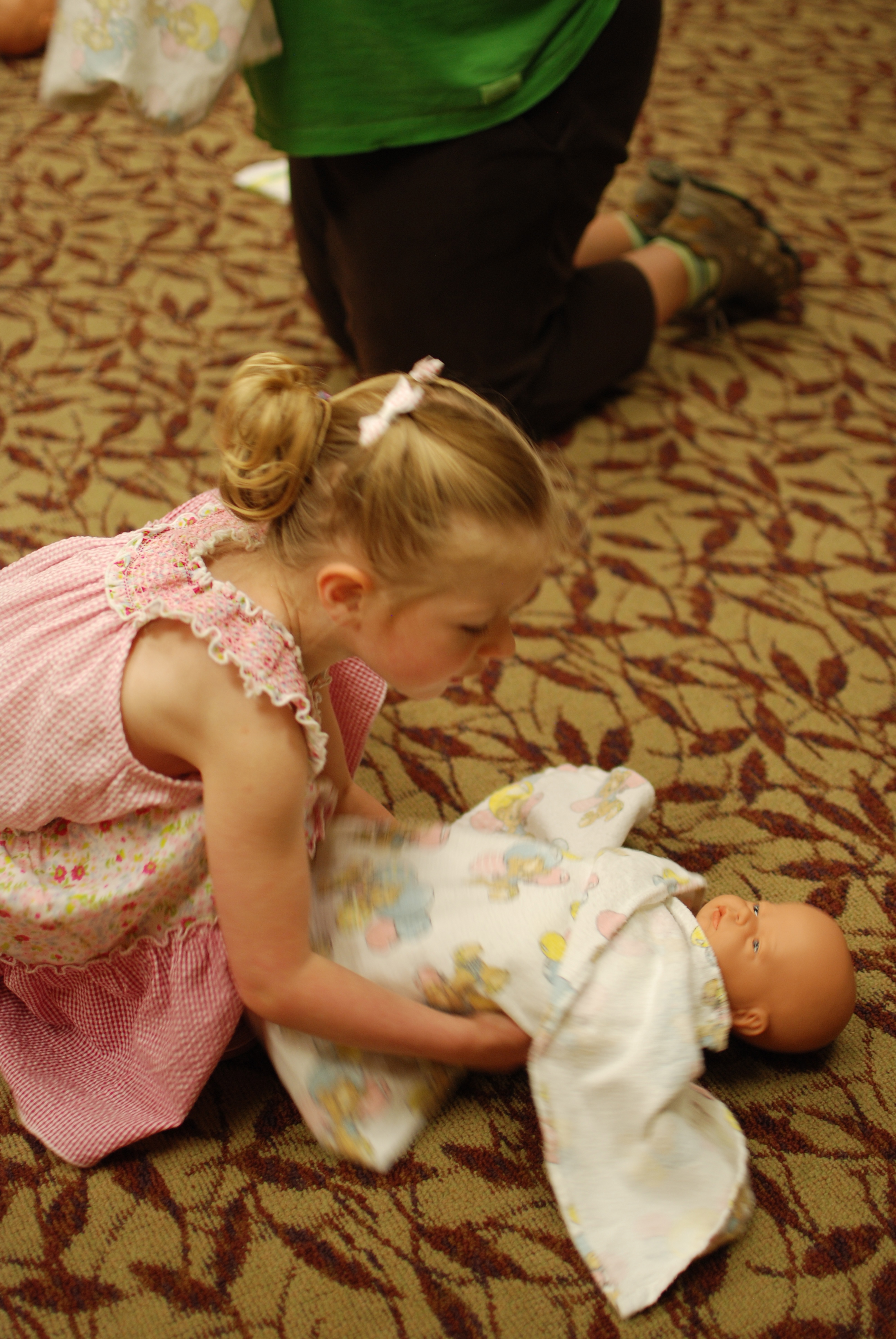 It was only an hour and she would learn how to hold a baby, wrap a baby and change a diaper. She did fantastic and didn't wait for directions, just wrapped that baby up and was done before most of the class of kids.
